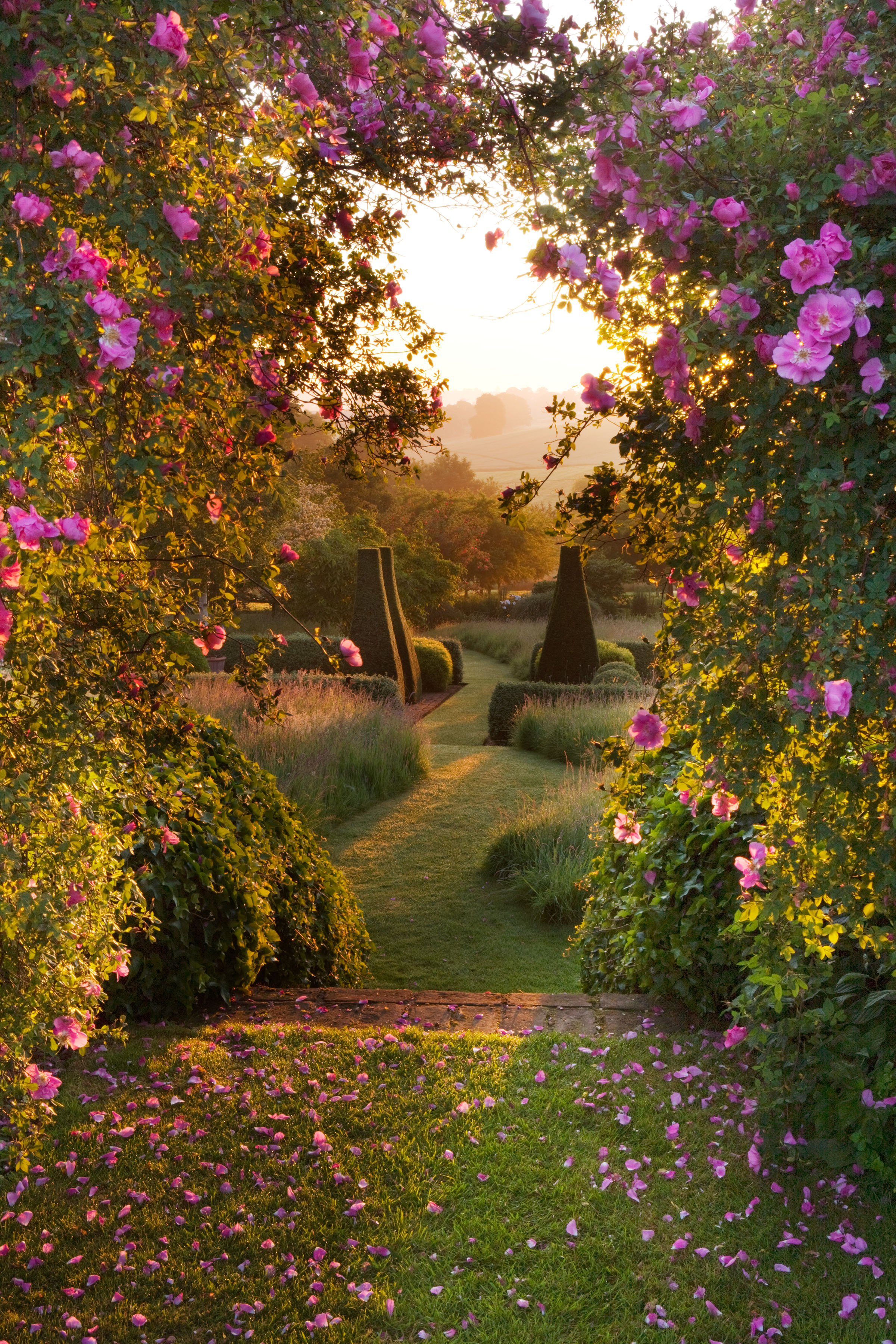 PETTIFERS, OXFORDSHIRE: DAWN LIGHT HITS THE PARTERRE FRAMED BY ROSE ARBOUR