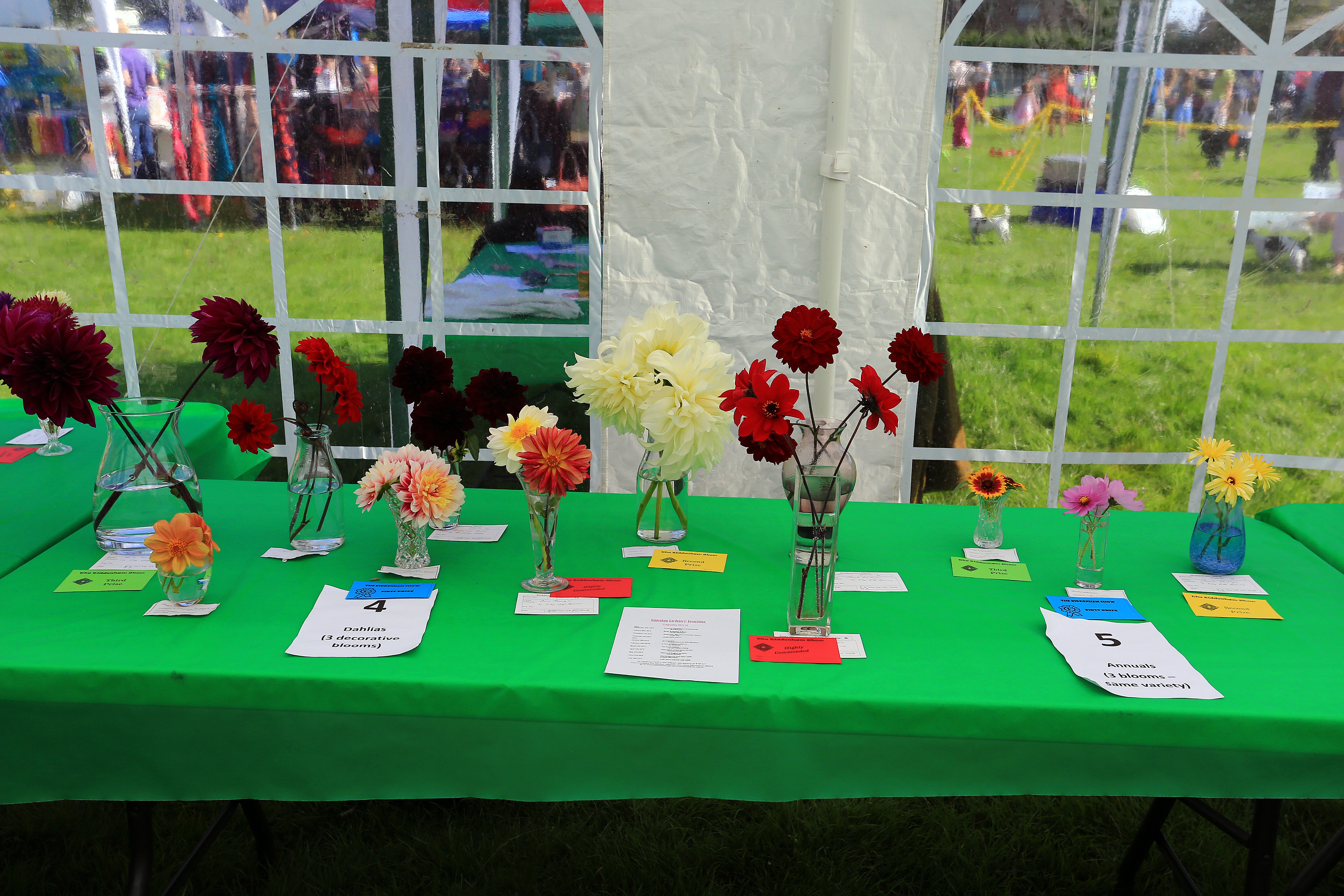 Categories 4 (Dahlias – 3 decorative blooms) and 7 (mixed flowers, 3 blooms) – any variety